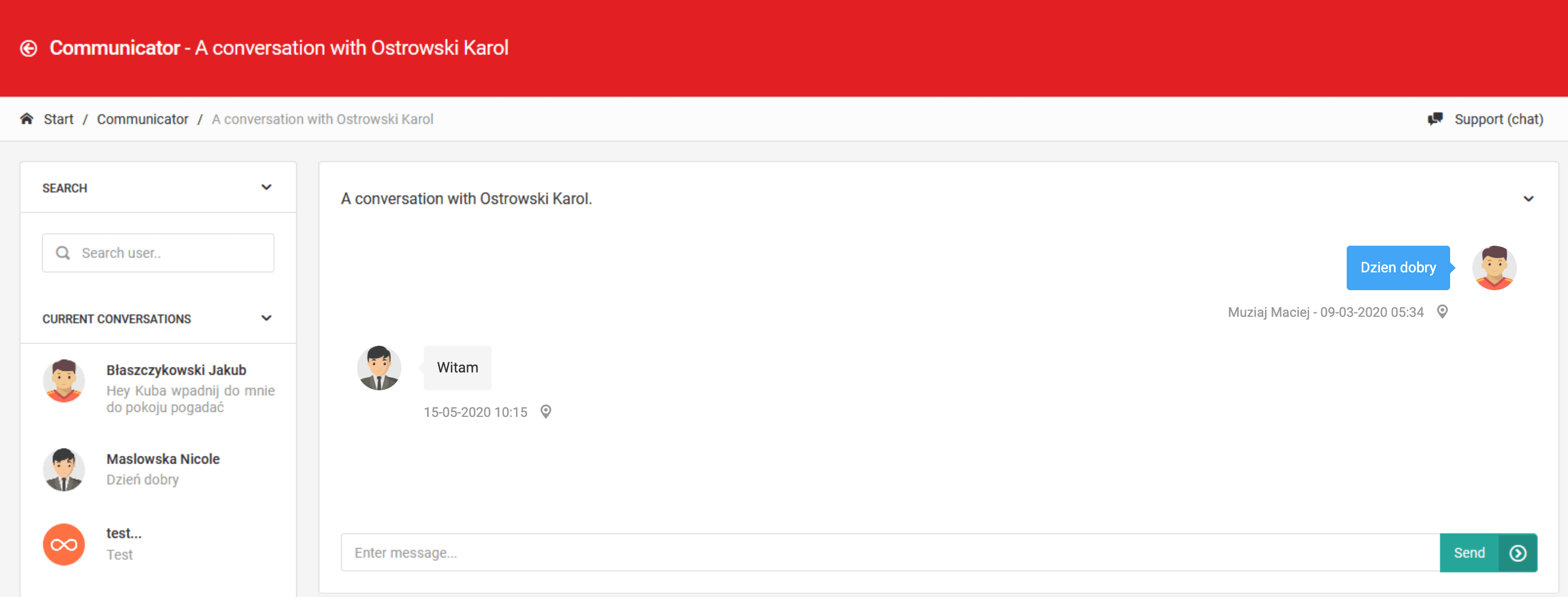 Jak z mobilní aplikace, tak z webového prohlížeče je k dispozici komunikátor, který umožňuje komunikaci mezi uživateli systému. K dispozici jsou dva režimy konverzace - soukromá (1 na 1) a skupinová konverzace, které se může účastnit více uživatelů.