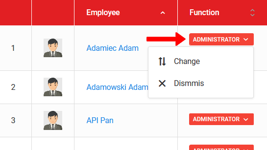 Lai dzēstu vai mainītu darbinieka lomu, noklikšķiniet uz krāsainajām plāksnītēm blakus darbinieka vārdam. Kad noklikšķināsiet, jūs redzēsiet divas opcijas, no kurām izvēlēties: "atlaist" vai "mainīt". Atlaišana nozīmē, ka loma tiek atņemta lietotājam, un noklikšķinot uz mainīt, jūs varat rediģēt pašreizējo lomu.