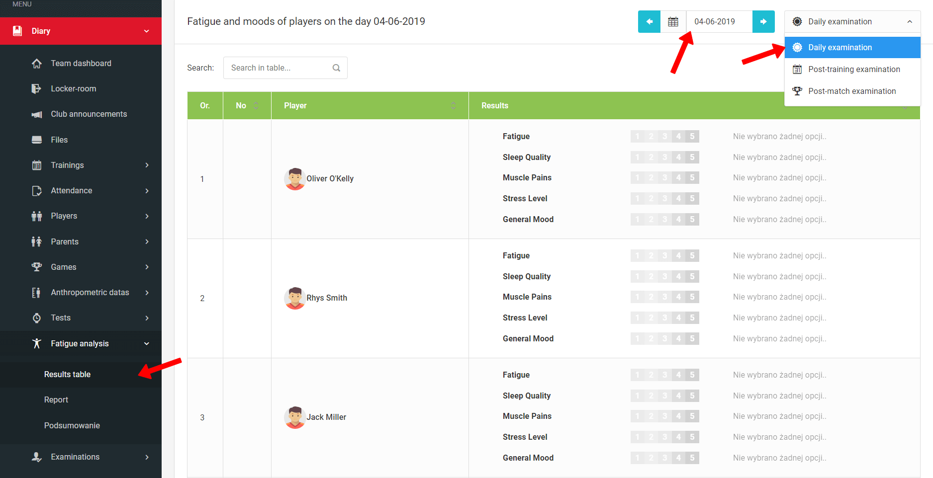 В исключительных случаях, когда игроки не передают данные через мобильное приложение, вы можете ввести их вручную через систему. Для этого выберите в левом меню дневник анализ усталости протокол.