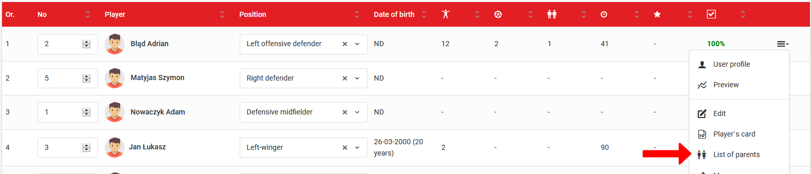 Da ročno dodate starša, odprite seznam igralcev, nato izberite igralca, katerem želite dodati starša. Ko kliknete na seznam staršev, se bo prikazal obrazec za dodajanje starša.