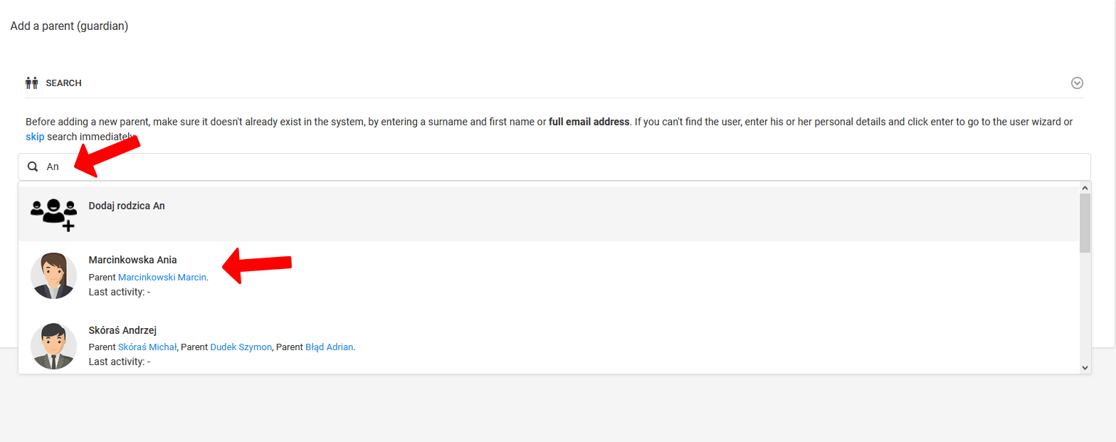 Če starš že ima račun v sistemu, ga lahko poiščete v brskalniku z vnosom njihovega e-poštnega naslova ali priimka in imena. Ko se starš, ki ga iščete, prikaže na brskalnem seznamu, ga morate izbrati na seznamu in sprejeti, da ga dodate k računi igralca. Ta lastnost je zelo uporabna, ko ima starš več kot enega otroka, ki trenira pri tej enoti.